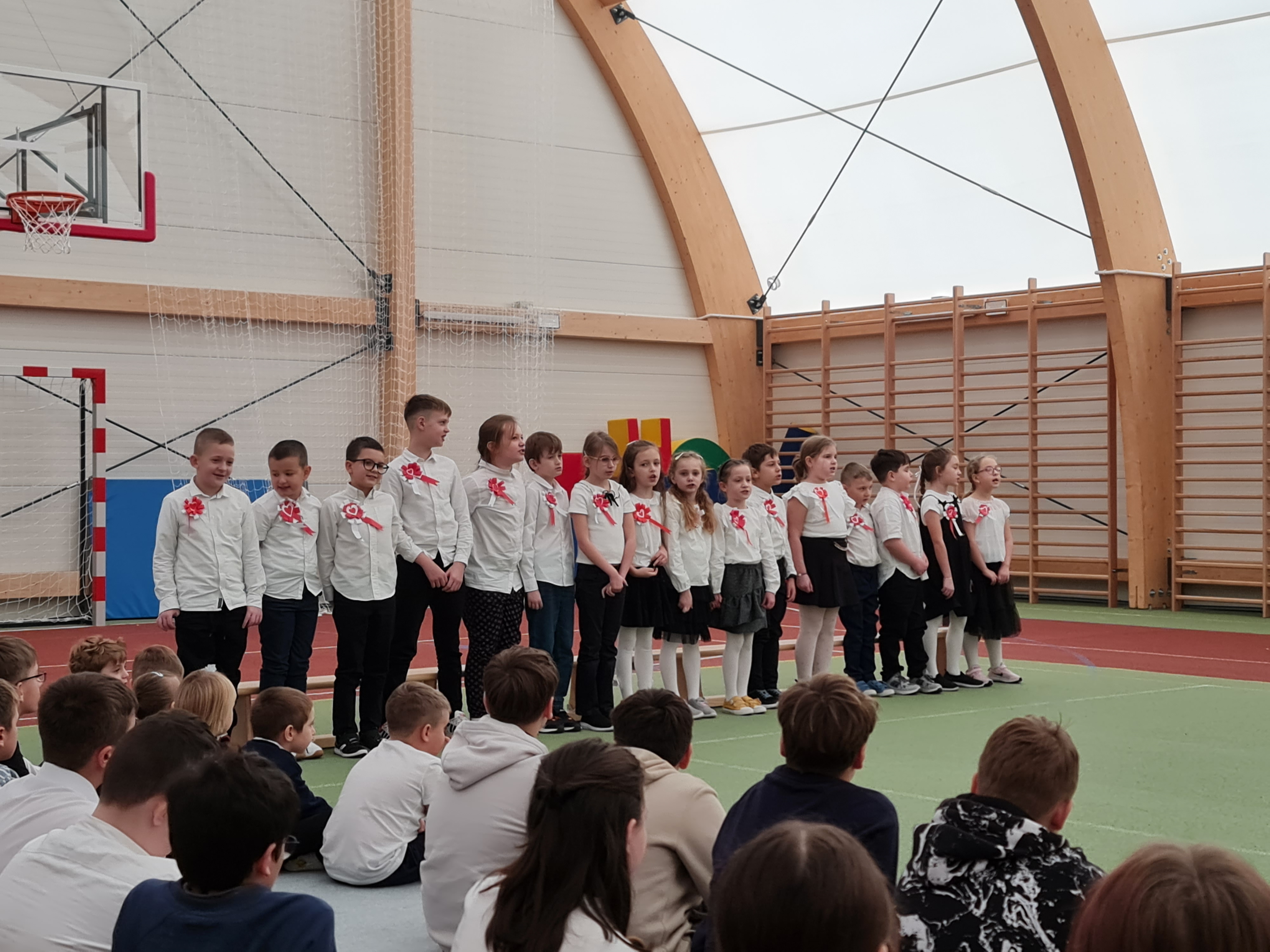 10 listopada 2025 r. w naszej szkole na hali sportowej uczniowie uczestniczyli w uroczystej akademii z okazji Narodowego Święta Niepodległości przygotowanej przez uczniów klasy 5 pod opieką pani Małgorzaty Bieniek. Na początku uroczystości po wprowadzeniu sztandaru cała społeczność uczniowska odśpiewała Mazurka Dąbrowskiego włączając się w akcję Szkoła do Hymnu.
